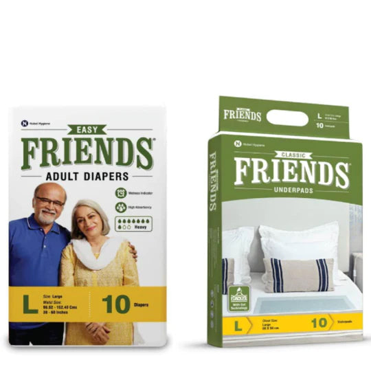 The Combo Pack consists of 2 packs of Friends Classic dry pants along with 1 pack of Overnight diaper pants for adults. Available online in M, L & XL sizes.